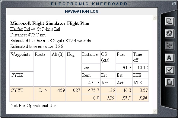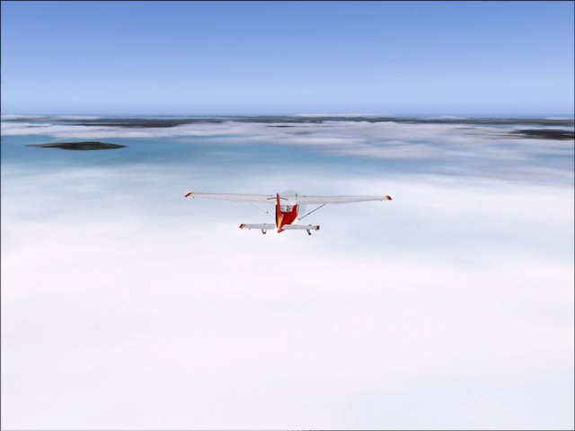 Today I found out that Canada is not always in the dark. Sun does make it there on occasion. That's good, I was starting to worry for the poor people that live out there. Since it was day, and since the weather was nice I chose to fly VFR this time. There are no high mountain peaks, nor very many sightseeing places on the route from Halifax to St. Johns, so I flew directly (heading 088) at the altitude of 7,500 ft. It is cold in Canada at this time of the year, and I can notice that by how my plane performs, notably, it flies much better (the air is more dense). Basically, the density altitude is always much lower than the actual altitude, which means that I can go higher and faster. Well, now that is not such a big deal as I am flying over the lowlands, but I could have used that while I was in South America flying over the Andes. Interestingly, as I was flying towards the coast, it was getting warmer, and I had to keep adjusting the mixture to get optimum performance and gas mileage even though I kept the same altitude. The approach was interesting as St. John's was enveloped in very thick fog. If I did not have the ILS it would have been a big problem. This was the worst visibility landing so far on this trip, but I am sure there will be more to come. Despite that, the landing was one of the softest ones ever. Go figure. |