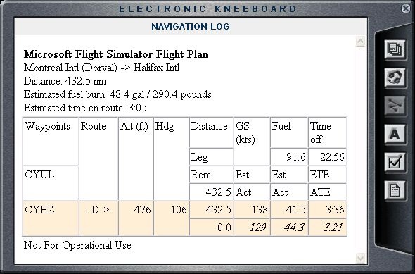 It was a dark and moonless night at the frozen north. Days here are so short that I just have to fly at night. IFR makes it easier though. There is no need to look out the window until the final approach. I did not fly yesterday, but I took the time to go over my flight plan and modify it. Everything will stay the same as I originally planned until I get to Cairo. From there, I will go back to Europe then Ural mountains, over Mongolia to India, Indonesia, Australia, back to Indonesia than Philippines and finally Japan. From Japan to Salt Lake City I will follow more less the same route as I originally planned. This change will make my trip much longer, but that is OK. I will even stop in Copenhagen. This part of my trip goes over the area that is more less uninteresting from the air (at least from 7,000 ft.). Speaking of altitude, last time I flew, I had major tail wind that resulted in really high ground speed. This time I had no such luck. I did have some tail wind, but nothing like last time. Now I got greedy. The direct route from Montreal to Halifax was following the heading of 116. I did not experiment with the altitude too much, and just stayed on my pre-assigned 7,000 ft. |