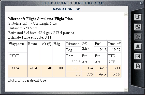 The fog has lifted and the night has fallen. I did find time to fly another leg today but I could not start early enough to at least take off during the daylight. That is OK though, as I did get to see the St. John's area on my way in. I created an IFR plan to fly directly from St. John's to Cartwright following heading of 001 (due north). I have selected 7,000 ft as my cruising altitude and that proved to be ah excellent choice. As I was climbing towards 7,000, I was flying through really strong head wind (gs of < 50 kn), and it was getting stronger and stronger. There was no way I would have had enough fuel to make it to Cartwright at those conditions. Just when I thought I will have to fly at the lower altitude to get away from really intense head wind, something weird happened. I have encountered severe (the worst yet) turbulence around 6,000 ft. and it almost seemed as if there was a wall I couldn't fly through. After unsuccessfully trying to get through the turbulence area 4-5 times (the plane would stall every time and I would start losing altitude) I was ready to give up and request lower altitude from the ATC. But then I though, if there is so much turbulence, there must be the wind direction change there (in addition to really having to see what is on the other side of that wind wall). Sure enough, as I went over 6,200 the wind started to shift and finally I got the ground speed of 134 kn. The turbulence was so intense though I was worried that the plane would fall apart. The approach was OK, although, there was no ILS, nor tower at the Cartwright airport. The lights were on though, and that is all I needed. Chalk this up as another perfect landing. |