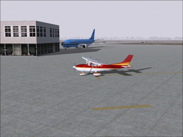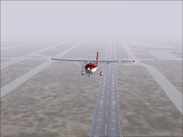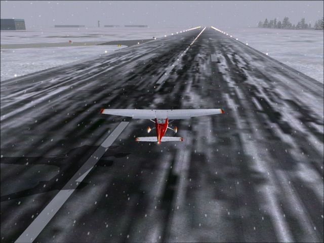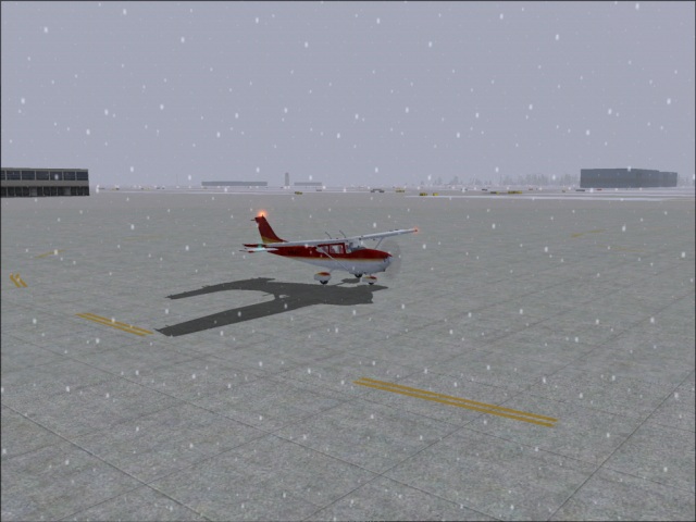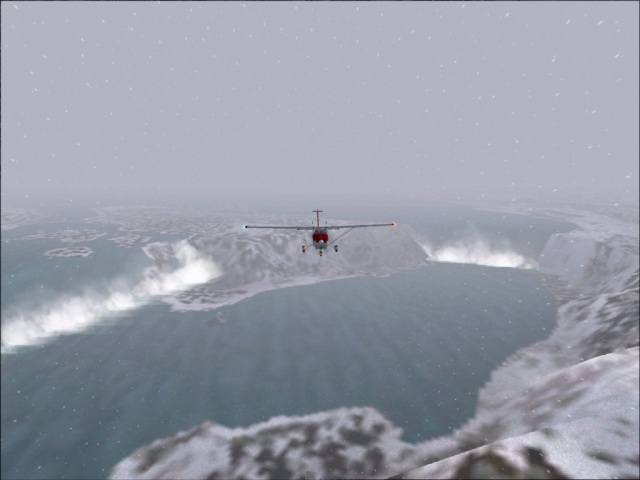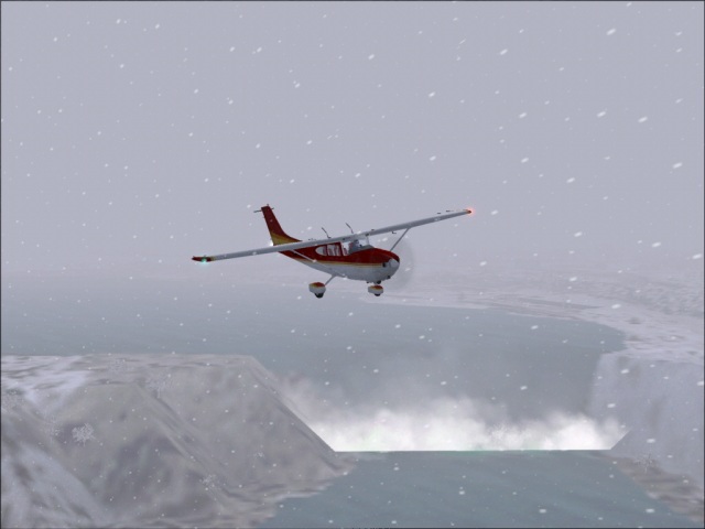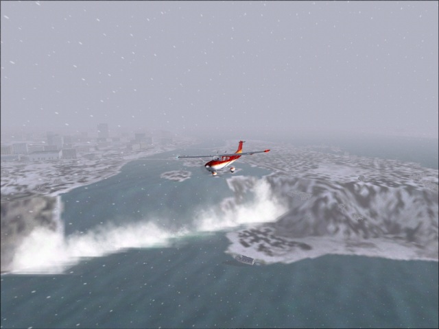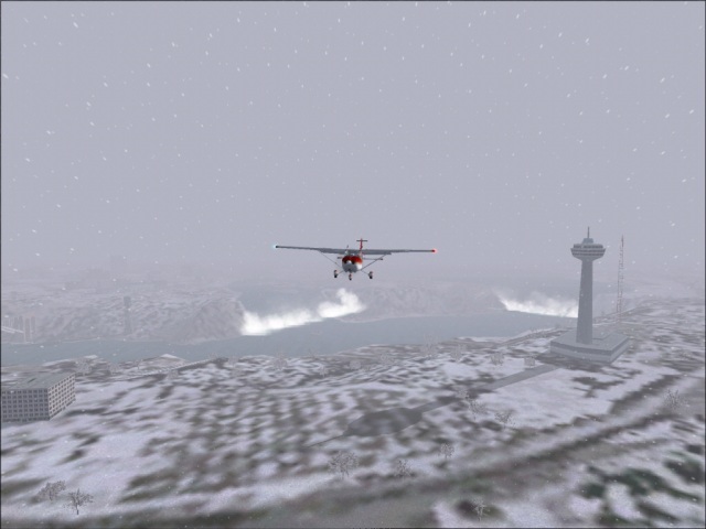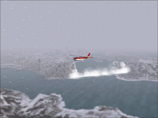 It seems that the low pressure front is still hanging around the eastern area of the US. Knoxville airport was also IFR only, so once again, I had to create and file a plan and all that. The only reason I did not want to do that (not that I had any choice), was to be able to take a closer look of the Niagara falls later. Well, I still did that, but I nearly gave poor ATC guy a heart attack. Oh well, he will get over it. I took off from the Knoxville airport in very dense fog, and quickly climbed to 7,000 ft. I first flew to Buffalo VOR (heading of 039) and from there to Toronto (heading 300). That way, I flew more less directly over the Niagara falls, so the detour was not that big of a deal. When I got to Niagara it was snowing, so the screen shots were not all that great, but since the rendering of the falls in the FS2004 is not very impressive, it was probably better that way anyway. Of course, that means that it was snowing on and off during my approach and landing, but despite that (and very strong cross winds) it all went without any problems. I must be getting better at this flying thing. |
