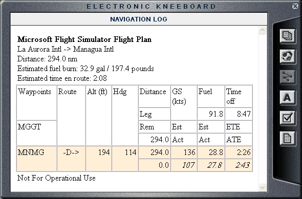 For once, I was glad this was actually virtual trip and not a real one. Tomorrow there are general elections in Guatemala, and I keep seen reports of unrest and violence in the news. Good thing that the FS2004 is not that realistic. I started early in the morning as I was hoping to be able to complete two legs of my trip today. First one is rather short, less than 300 nm. I was following the weather in the region for the last several days, and it was relatively OK, but they did have scattered thunderstorms, and 182 does not perform to well in those conditions, especially during the takeoff and landing. My flight plan today was to follow the straight line from Guatemala City to Managua. As I was leaving Guatemala City it was foggy, so the visibility was rather poor, but about 40 nm to the south, the fog lifted, and I was able to enjoy the scenery. Today's trip took me over the rural parts of Guatemala, El Salvador, Honduras and finally Nicaragua. Initially I had to fly higher (10,000 ft), but 60 miles into the trip, I was able to go down to 9,000 ft so that I can see the land features better. Guatemala City seemed very interesting, buildings were mostly in Spanish style, which I assumed was appropriate. I was surprised though how small some of those countries are. I went over 4 countries, and the total distance was less than 300 nm. I was following my progress on a map as I was flying and was amazed with the details I could see. After the fog lifted I flew over the border into El Salvador, country of over 6 million. I went close to the San Salvador, the capital of El Salvador and I took a nice photo of it from 9,000 ft. Below, you can see San Salvador and Ilopango International Airport, right next to Lago de Ilopango and in the distance the Pacific Ocean. After that, I went over the very nice bay called the Bahia de Jiquilisco. From there, I flew over Golfo de Fonseca (Honduras), and finally into Nicaragua. Managua, the capital of Nicaragua, is situated between two lakes. The smaller and the closer one to Managua is Lago de Managua and the very large one, to the south east is Lago de Nicaragua. Approach and landing at Managua airport were rather easy and uneventful, just the way I like it. |