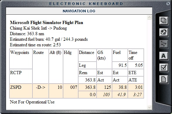 Wasting no time I got ready and took off from Taipei airport with first light. I climbed to 7,500 ft. and set the course directly to Shanghai, China (009). This was relatively short flight over the East China Sea and along the East coast of China. I still had good luck with the weather, it was partially cloudy most of the way. There was some fog as I was taking off from Taipei, but nothing major. The visibility was still tolerable. With some tail wind, the flight did not take long time at all. I got clearance to land on runway 17, so I flew parallel to the airport, made a right turn, and lined up for landing. Few minutes later my plane was parked and I was done. |