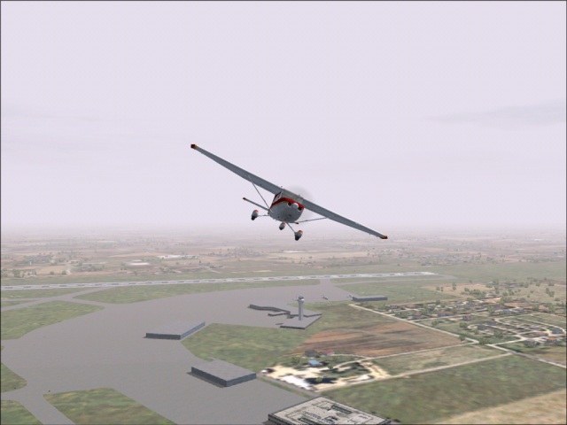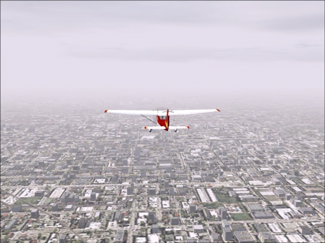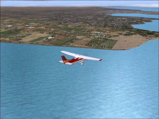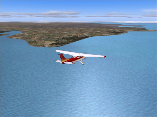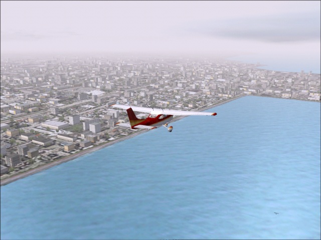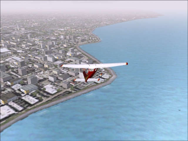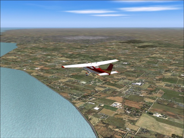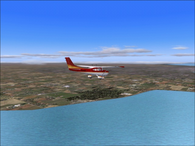 Buenos Aires, the capital of Argentina, is located at 34 00 S, 64 00 W. At this time of the year, it is nice and warm there (for those of you who like that kind of weather). Me, I prefer snow, despite all the shoveling I had to do lately. This flight was very short about 130 miles, and it took me directly to the capital of Uruguay, Montevideo. Direct route from Buenos Aires to Montevideo was following the heading of 094. Since the flight was short, I did not climb too high (5,500 ft.). Despite some cloud cover and ground haze/fog I was able to take few nice shots along the way, plus the weather cleared up over the Rio de la Plata which also helped. I had to do another crosswind landing, but this time it was perfect. I really am getting better at that. |