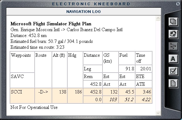 Late evening in Patagonia... I got my plane ready, and took off at dusk, heading south (186). My stay in Argentina was rather brief, and now I am going back to Chile. I had to zig-zag a bit to get to Punta Arenas in Chile (and eventually to Rio Grande, Argentina), as the direct route from Valdivia was a bit too long for a single step. It might have been doable, but I did not want to get into the lower 1/4 of my gas tanks if I really did not have to (there are few parts of this adventure when I will probably have to do that though). Interestingly, during the take off from the airport, it was rather dark, as the night was falling and the sky was overcast, but as I started flying south, and got above clouds, it became somewhat lighter. At this time of the year, the further south you go (providing that you are south of the equator), the longer the days are. Suggested altitude for this trip was 6,500 ft. but I chose to fly at 9,500 ft. instead. I found that to be the sweet spot that would get me there the quickest with the least amount of fuel. So at 00:50 local time I have arrived to Punta Arenas, the southernmost city on the planet Earth. It is located at the Strait of Magellan at, what used to be, one of the busiest shipping routes (that is until the Panama Canal was made). The weather was OK, and the landing not too bad. |