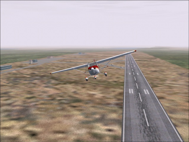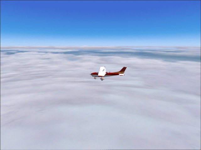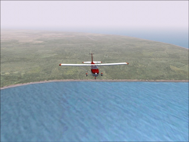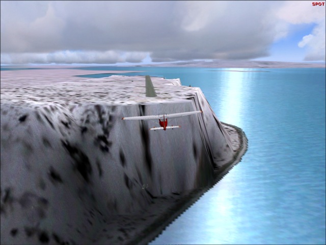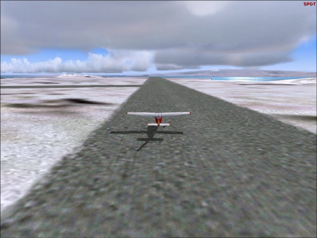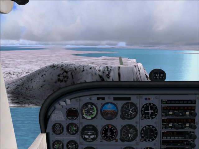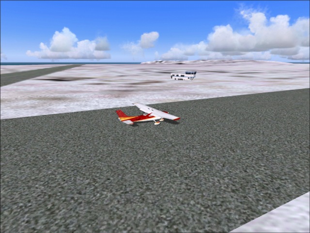At 11:00, Saturday, November 22, 2003 I got my plane ready, created the flight plan and took off towards the Antarctica. Most of the flight was over the ocean, and I was not sure if it was the Pacific or the Atlantic, as I was right on the border where the two meet. Doing this in real life would have been very scary. Flying 700 nm over the very cold ocean and worrying about what can go wrong... Doing this in the flight simulator however, was very exciting. This was one of the longest flights on my around the world trip, so I was very careful about choosing the altitude, and speed to get the best fuel efficiency. I had tail wind, which helped a lot, but even considering that, I did very well. I used only 56 gallons of fuel for this flight of 712 nm which translates into 12.7 nm/gal, and as they say, that ain't bad. During my flight I was calculating how much fuel I need at different altitudes and at different speeds based on the fuel flow and the ground speed (shown by my GPS unit). The real test though, will be tomorrow, as I will have to fly from Antarctica to Falkland Islands, and if the weather does not change I will have to fight head wind most of the way. In all of the pages so far, I have included the flags of countries I flew over or landed at, but now I was not sure what to do. Antarctica is a coutryless continent, and as such does not have a flag. Feeling sorry for the poor continent I've decided to do something about it and designed the Antarctican flag myself. It is the outline of the continent (white) on the blue background (which represents three oceans that surround it). I made it in GIMP by drawing the outline with the mouse and then filling it with white color and coloring the rest of the flag blue. OK, so it is not very creative I admit, but it is still better than nothing. I like it and that is all that matters. The approach and landing were uneventful (just as I like it), the weather was cooperating and I was able to get really nice screen shots. I found it funny though, that the ATC tower at base Marambio (in the simulator) is a trailer (see below). |