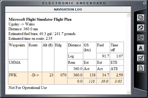 This is very exciting... after a very long time I am coming home. I did not quite make it to Salt Lake City yet, but I have arrived to the USA. It is great to travel, but it is also great to come home. I've decided to wait for the Sun to come out, as I wanted to fly over the Bering Strait during the daylight. It turned out that waiting was not necessary. At 7 am Salt Lake City time (01:00 Anadyr time), the Sun started coming out. Not quite midnight sun, but close. I quickly got ready and took off, heading 070, directly towards the Wales, Alaska. I strayed a bit from my route in order to fly directly over the Bering Strait (OK, in order to take a cool picture of the Bering Sea and the Chukchi Sea with the Bering Strait in the middle). The picture is not overly great, but the places do sound kind of exotic which makes it interesting. Other than that, it was interesting to finally visit the last frontier (not to be confused with the final frontier). I've been planning to visit Alaska for quite some time now, and it seems that this year I will finally get to go there (no, not by the FS2004, but by Delta). I really cannot wait. After flying over the Bering Strait, I landed at the Wales airport and immediately went to create flight plan for my next leg. |