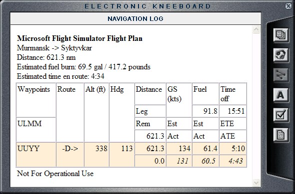 At around 4 pm local time I left Murmansk airport and set the course to Syktyvkar (heading 125). The area I was flying over was not very interesting, especially from this altitude (5,500 ft.). The flatlands, just north of Ural Mountains do not seem to be very populated. There were very few towns that I have seen on my way. After crossing Kala peninsula and flying over the part of the Barents Sea, I was over the mainland Russia. As I was getting closer to the Syktyvkar, the weather started getting very bad, the wind picked up and there was a lot of lightning. My plane was bouncing around like crazy. I had trouble keeping my heading during the final approach, but at the end the landing was very smooth. Since I was flying relatively low, I had to pull back on the throttle in order to try to use as little gas as possible. I was keeping my fuel flow at 11-12 g/hr and that seemed to be quite good. I have used about 60 gallons for some 630 nm. If I can achieve the same fuel efficiency on the upcoming long legs I will be quite OK. |