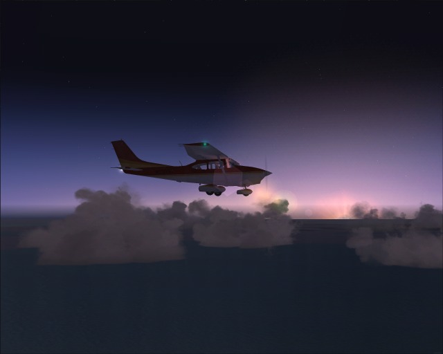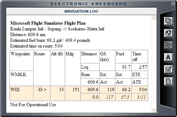 Not wasting any time, at 02:00 (local), I took off from the Kuala Lumpur International airport and set the course towards the capital of Indonesia, Jakarta (heading 151). The automated flight plan generator wanted me to fly at 3,000 ft. but I did not like that idea, so I climbed to 9,000 instead. It did take a bit longer, but I used less (virtual) fuel. The flight took me over the Straight of Malacca, Sumatra, the Java Sea and finally the island of Java where Jakarta is located. The weather was much better, only scattered clouds so the approach and the landing were much less stressful than during the previous leg. I will now rest and hopefully continue tomorrow. |