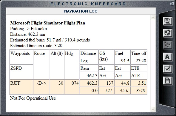 At 23:00 local time, Sunday night (or early Sunday morning, Salt Lake City time) I prepared my plane and took off towards Fukuoka, Japan. The whole flight today was over the East China Sea and once more it was in complete darkness. As a result I will save a lot of space on my server as I only have few pictures to show. As I was approaching Fukuoka, the winds really picked up, and the rain started falling. I had trouble keeping my heading and staying aligned with the runway. The landing itself was OK at the end, nothing broke. I went to park the plane at the gate while I get ready for the round two for today. |